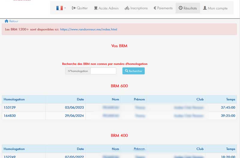 Puis une fois dans la page « Résultats », cliquez sur BRM pour voir tous les BRM que vous avez validé, ordonnés par distance et par date.