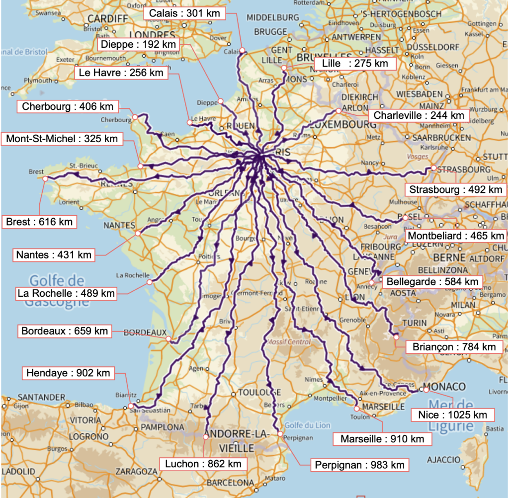 Les trajets peuvent être réalisés dans un sens ou dans l’autre, sur le parcours proposé. Attention, les parcours GPX sont dans le sens de la capitale vers une ville côtière ou frontalière : pour les trajets inverses, il est laissé au bon sens de chaque participant d’adapter son parcours de façon à éviter les sens interdits. De même, les sens de circulation peuvent évoluer : le participant doit en toutes circonstances privilégier les arrêtés de circulation en vigueur.